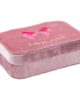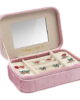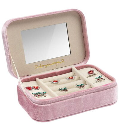 Lovely Konges Sløjd trinket box in pink velour with an embroidered bow on the lid. The Trinket box has an interior mirror and is divided into Rum for storing jewelry. The Trinket box contains: