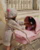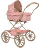 Beautiful Konges Sløjd doll stroller in a beautiful vintage style. The doll’s pram has a nice heart print in white and pink and has a quilted structure and wavy scallop edges.