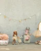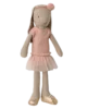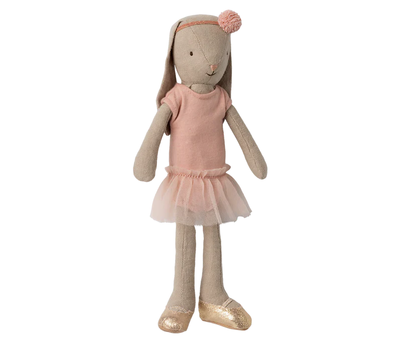 The well known Maileg bunny dressed up as a ballet dancer. It wears a rose colored suit, tulle skirt and ballet shoes.